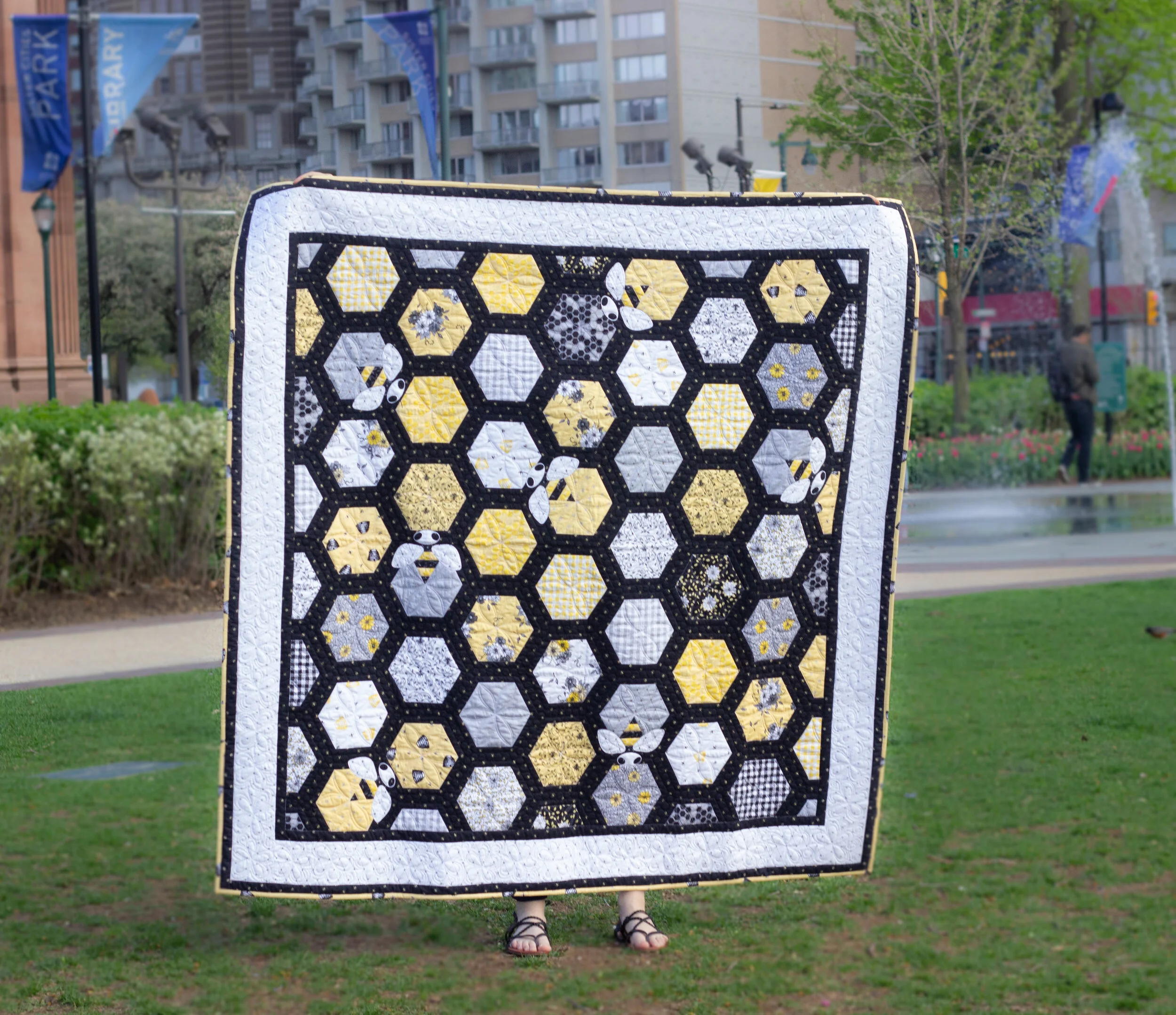 This quilt is fun and unique. It shows off the beautiful prints in my Honey Run collection with a hexie pattern. The quilt is cut using a template set for PERFECT fitting of the pieces. Yellow and black bees are pieced into the quilt, and their heads and wings are appliquéd on after. Your PRE-CUT kit will include the Hex Angle Template Set and all of the Jillily Studio appliqué tools.