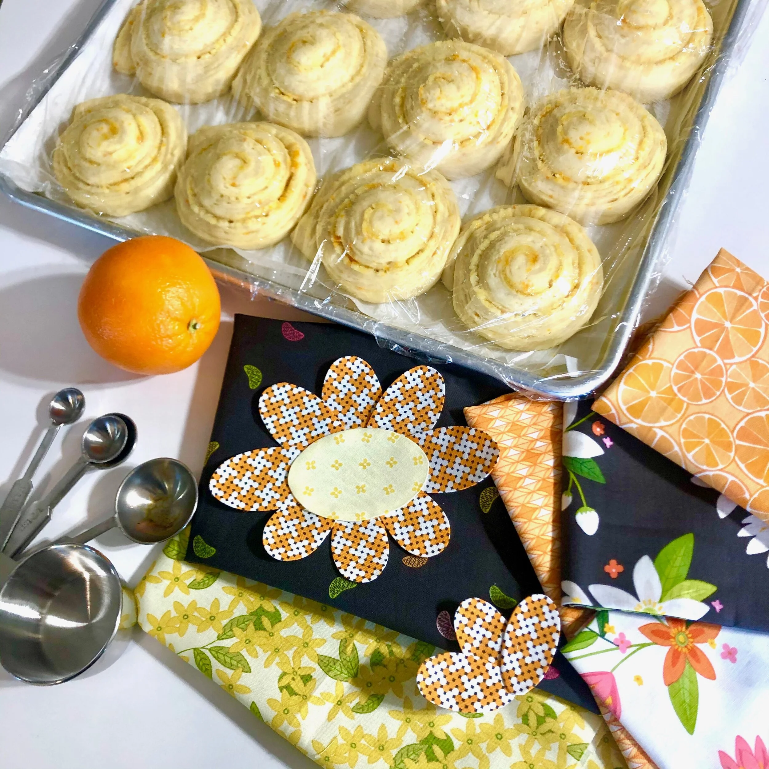 The orange prints are delightful and reminded me of one of my favorite recipes, Orange Rolls. These soft, sweet rolls are a real treat. My family loves them, and they don’t last long! As soon as the word is out that Mom made Orange Rolls, the kids magically appear, and the rolls disappear.