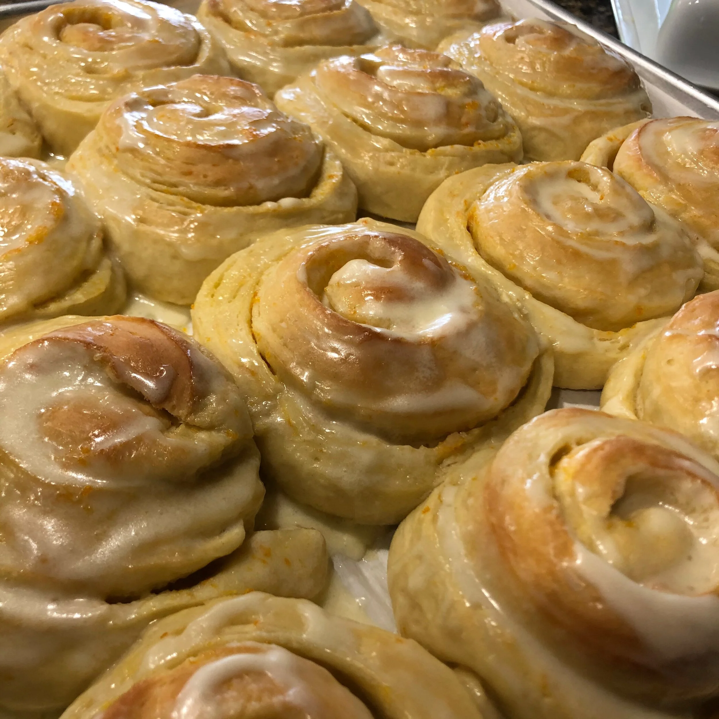 Roll out the chilled dough into a rectangle about 12” x 20” and 1/8” to 1/4” thick. Melt the butter and add the orange zest. Brush on to the surface of the rectangle. Sprinkle the sugar evenly over the butter mixture. Roll up the rectangle from the long edge, pinch the seam to seal it. Slice the long roll into 1” slices using a sharp knife or a thread. Place the rolls cut side down on greased cookie sheet. Space them about 1” apart so that they will raise to fill the whole sheet.Cover the greased plastic wrap. Let ris until double in size. Bake at 350 degrees for about 15-20 min until golden. Cool for about 15 min. While cooling, mix the icing ingredients until smooth, adding more juice or cream as needed. Spread with icing. ENJOY!